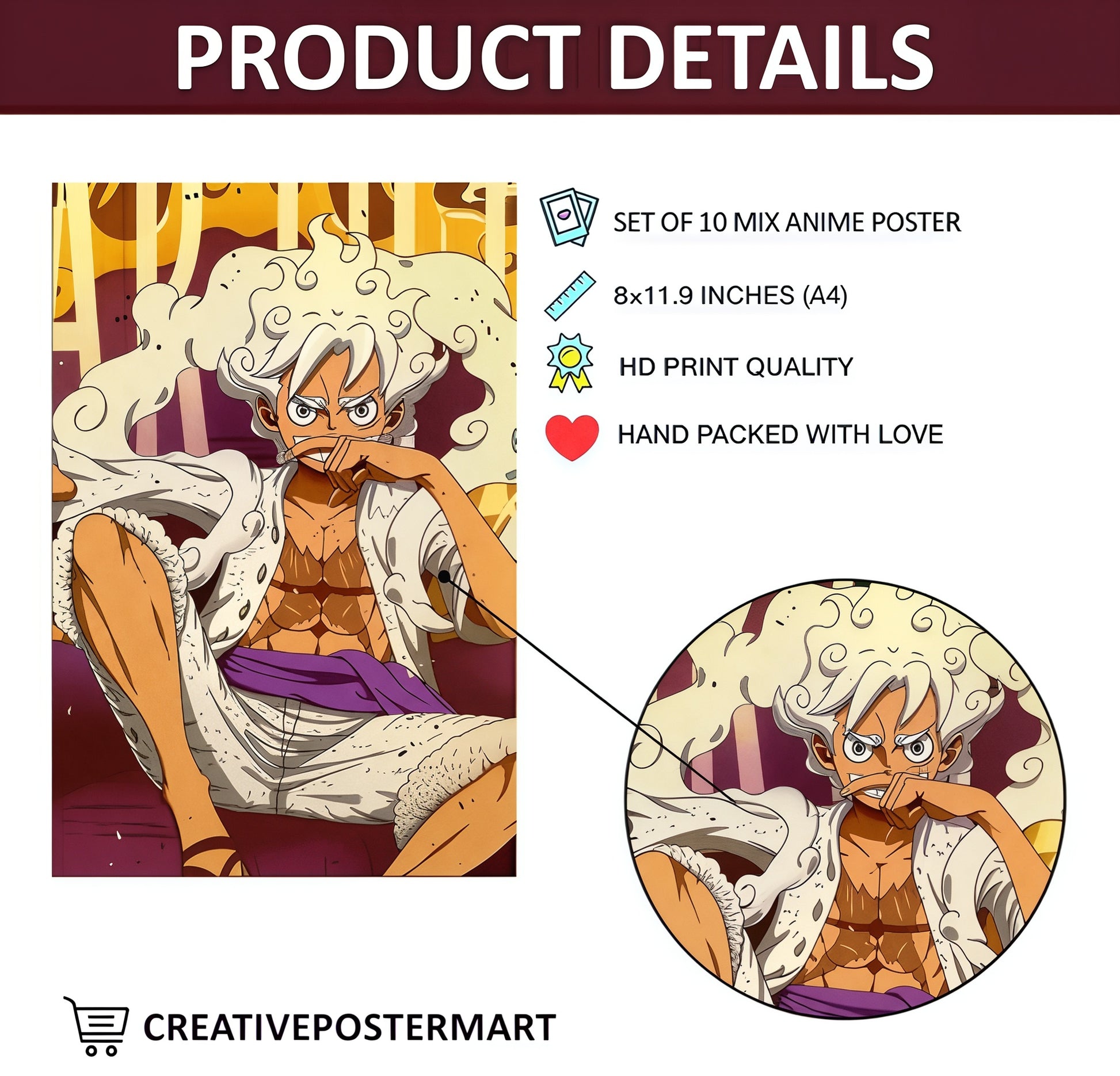 Immerse yourself in the vibrant world of anime with this stunning set of 10 printed posters, exclusively available on Meesho. Crafted on high-quality 350 GSM paper with a sleek Matt finish, these posters are not just decorations but a celebration of your favorite anime characters and scenes.